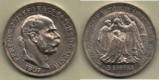 5 Koruna 1907 KB - jubilejní, 24.141g, hrana