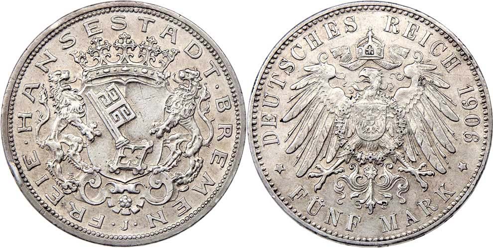 5 Marka 1906 J, KM.251 (pouze 41.000 ks), 27.670g, hr., vl.škr., rysky R!