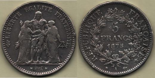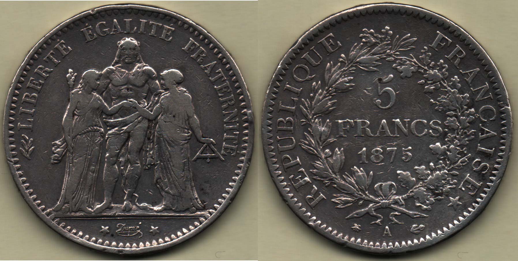 5 Frank 1875 A, Paříž, KM.820.1, 24.699g, hr., rysky, patina