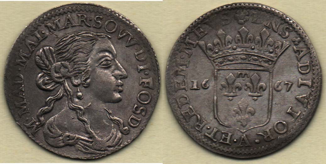 Luigini (10 Sol) 1667 A, KM.neuvádí, FW.II.11078-pod. 2.025g, dr.vada materiálu, dr.vada razidla, nedor., pěkná patina R!