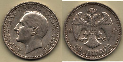 50 Dinár 1932 - bez značky mincovny, KM.16, 22.967g, dr.hr., dr.rysky, patina