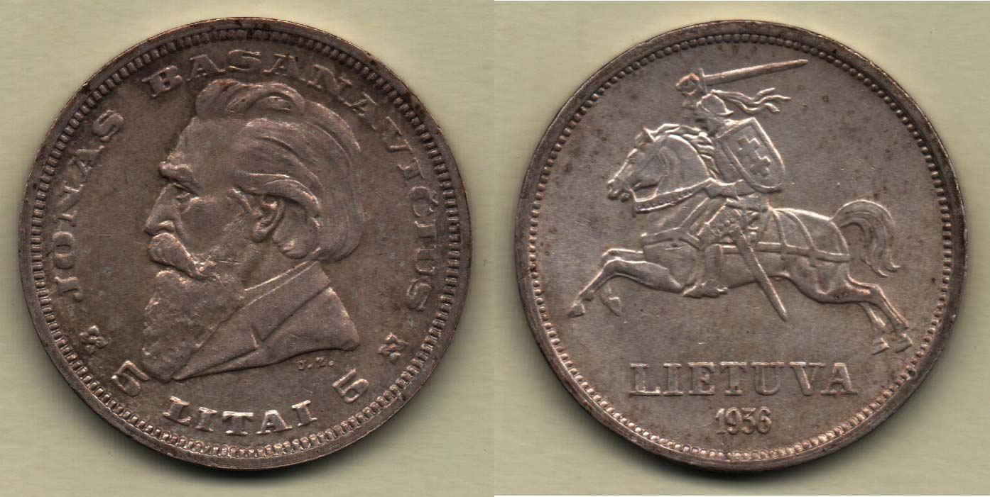 5 Litai 1936 - Basanavičius, KM.82, 8.948g, nep.hr., nep.rysky, pěkná patina
