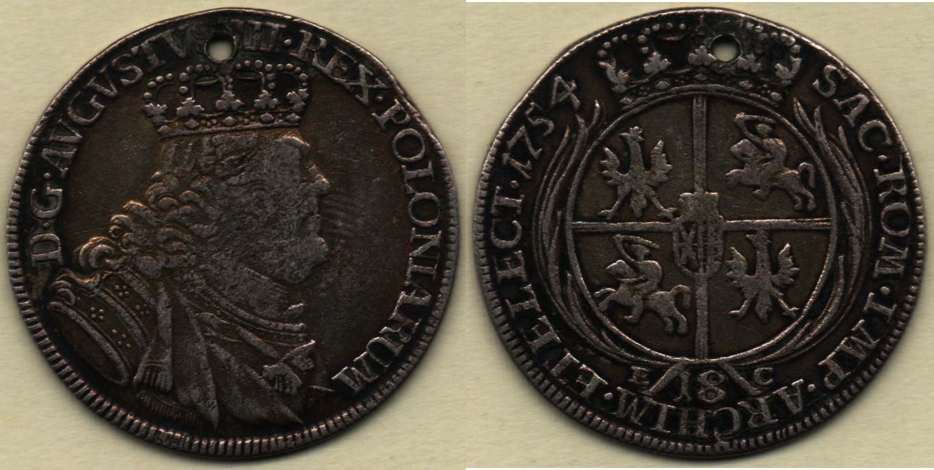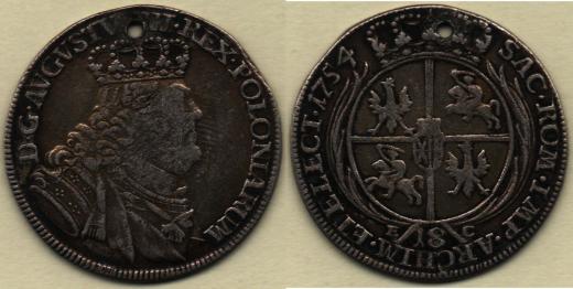 Tympf (18 Groš) 1754 EC, Drážďany, KM.148.2, 5.560g, dírka, krajový střížek, stopy zlacení, patina R!