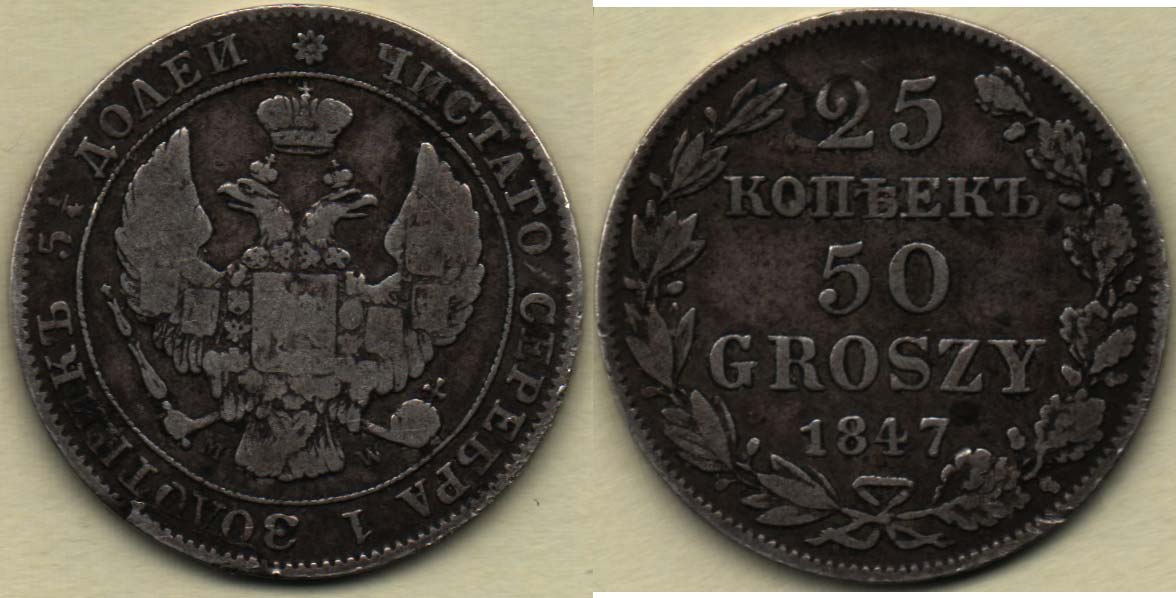 50 Grošů (25 Kopějek) 1847 MW, Cr.131, 5.053g, vada materiálu, dr.hr., dr.rysky, patina