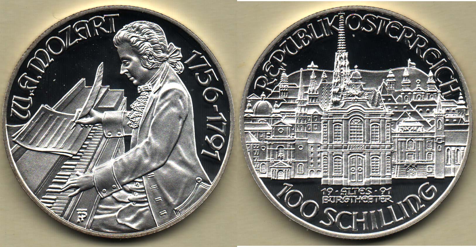 100 Šilink 1991 - Mozart a Burgtheater, KM.2998, kapsle