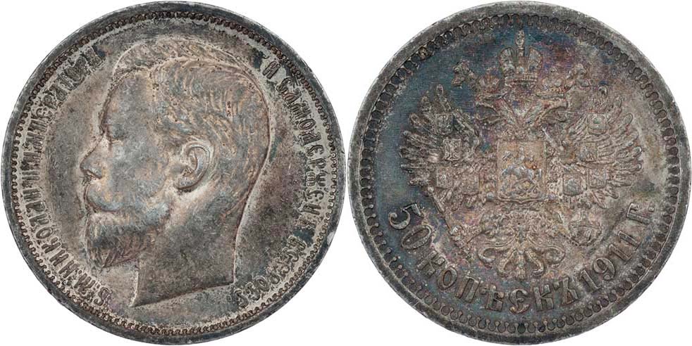 50 Kopějek 1911 EB, Petrohrad, Y.58.2, 9.947g, dr.hr., dr.rysky, pěkná patina R!