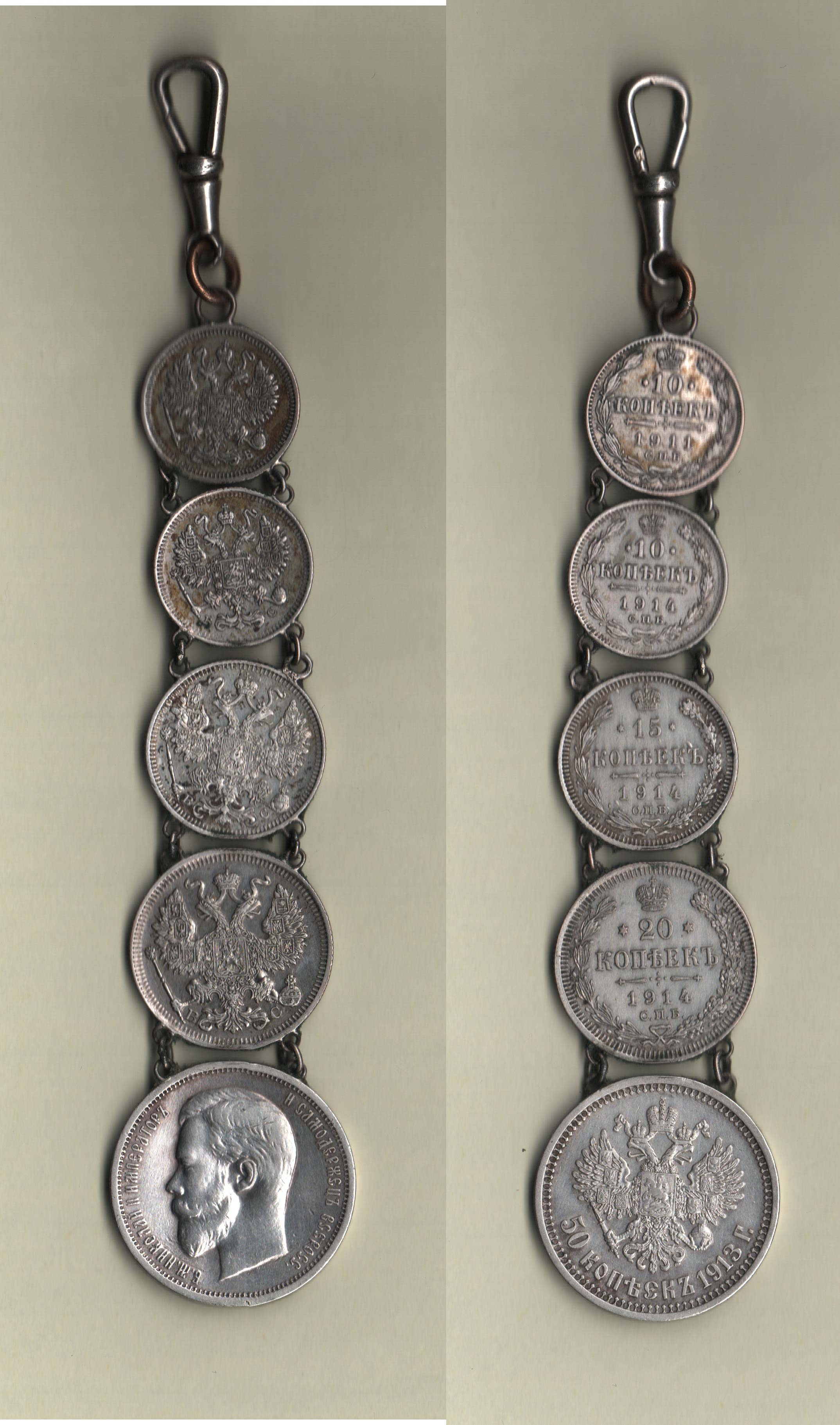 50 Kopějek 1913 VS, 20 Kopějka 1914 VS, 15 Kopějka 1914 VS, 10 Kopějka 1914 VS, 1911 EB, pět mincí spojených dvojitým řetízkem, závěs s karabinou, pat.