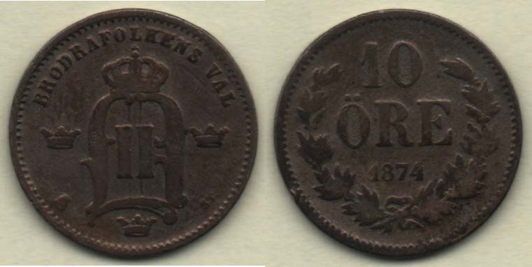 10 Öre 1874 ST, KM.737, 1.422g, nedor., patina R!