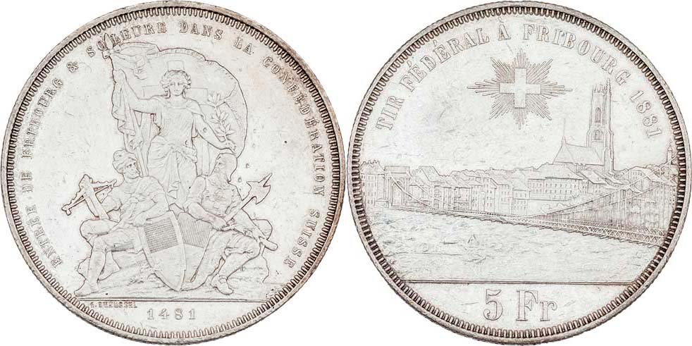 5 Frank střelecký 1881 - Friebourg, KM.S15 (pouze 30.000 ks), 25.006g, dr.hr., dr.rysky, nep.úhozy R!