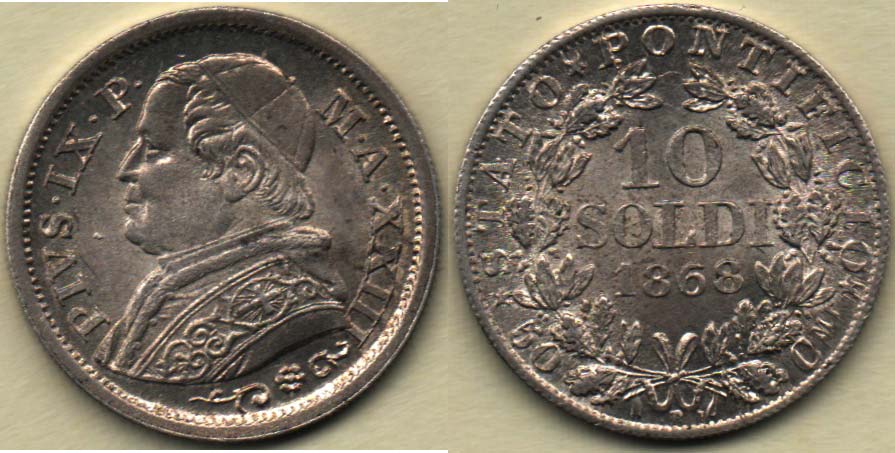 10 Soldi 1868 R - XXIII.rok pontifikátu, KM.1386.1, 2.518g, nep.hr., nep.rysky