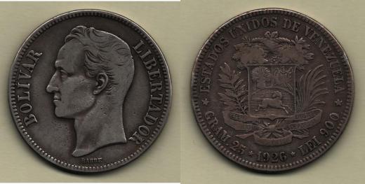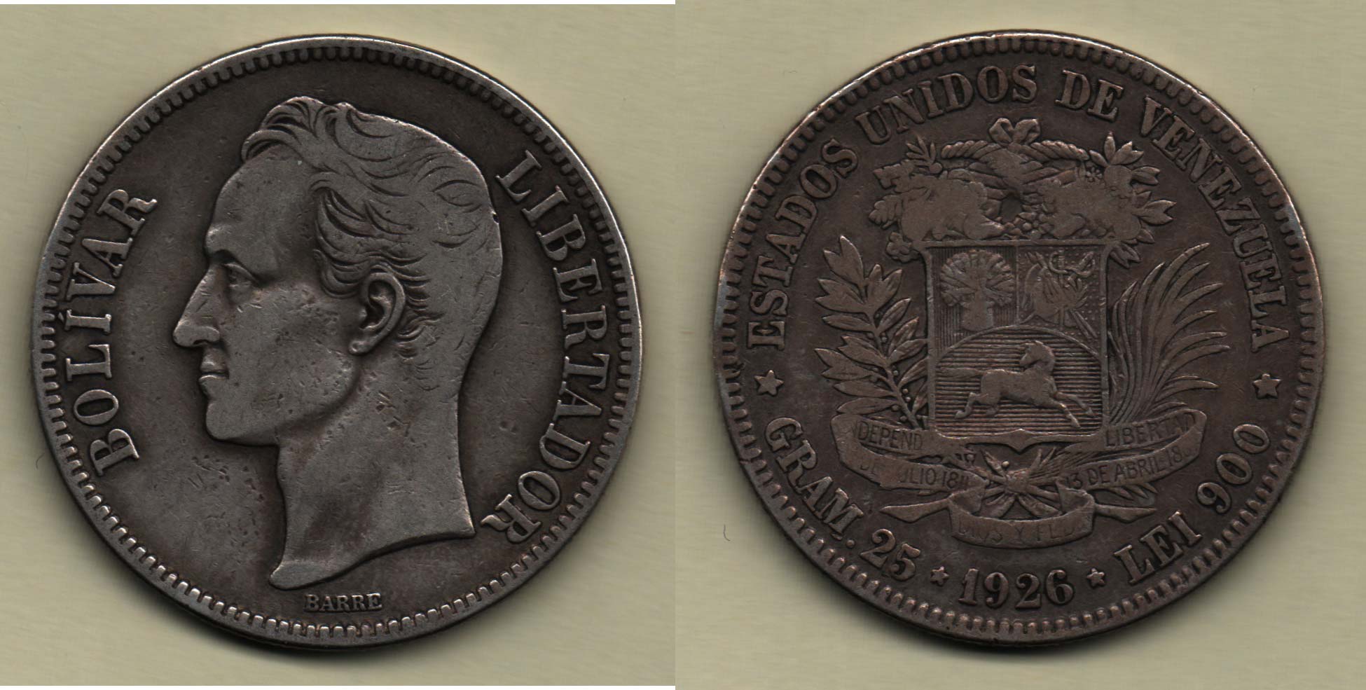 5 Bolivar 1926, Y.24, 24.772g, hr., dr.rysky, patina