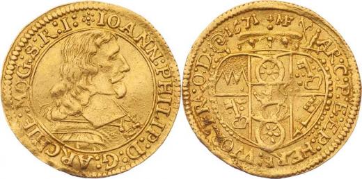 Dukát 1671 MF, KM.122, Fr.1656, 3.431g, mírně zvlněný, vlas.rysky, patina, téměř R!
