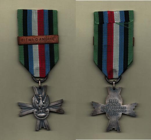 Pamětní kříž polských jednotek na západní frontě 1939 - 1945, postříbřený a patinovaný bronz 43x43 mm, na stuze štítek "BITWA O ANGLIE"