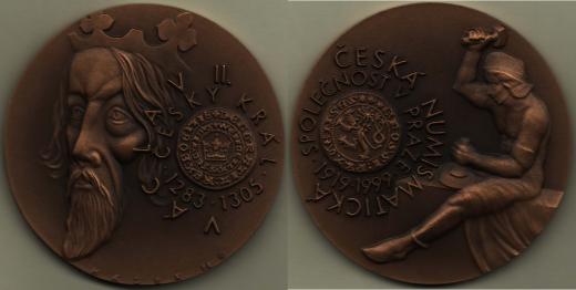 Hásek - 80.výročí založení ČNS 1919/1999 - Václav II. mírně zleva, replika groše, opis / pregéř, replika groše, opisy, Sign., patin.bronz 60mm, 150ks R!