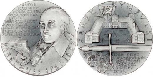 Kolářský - Karel Huss, numismatik a poslední kat 2004 - poprsí mírně zleva, katovna, písmo/ zámek Kynžvart, meč, písmo, Sign., patin.Ag 40mm, 28.757g, 75ks RR!