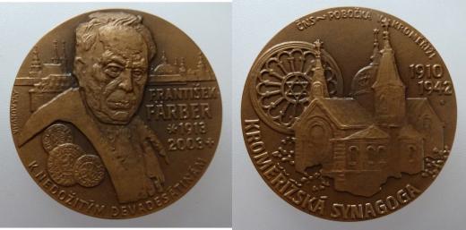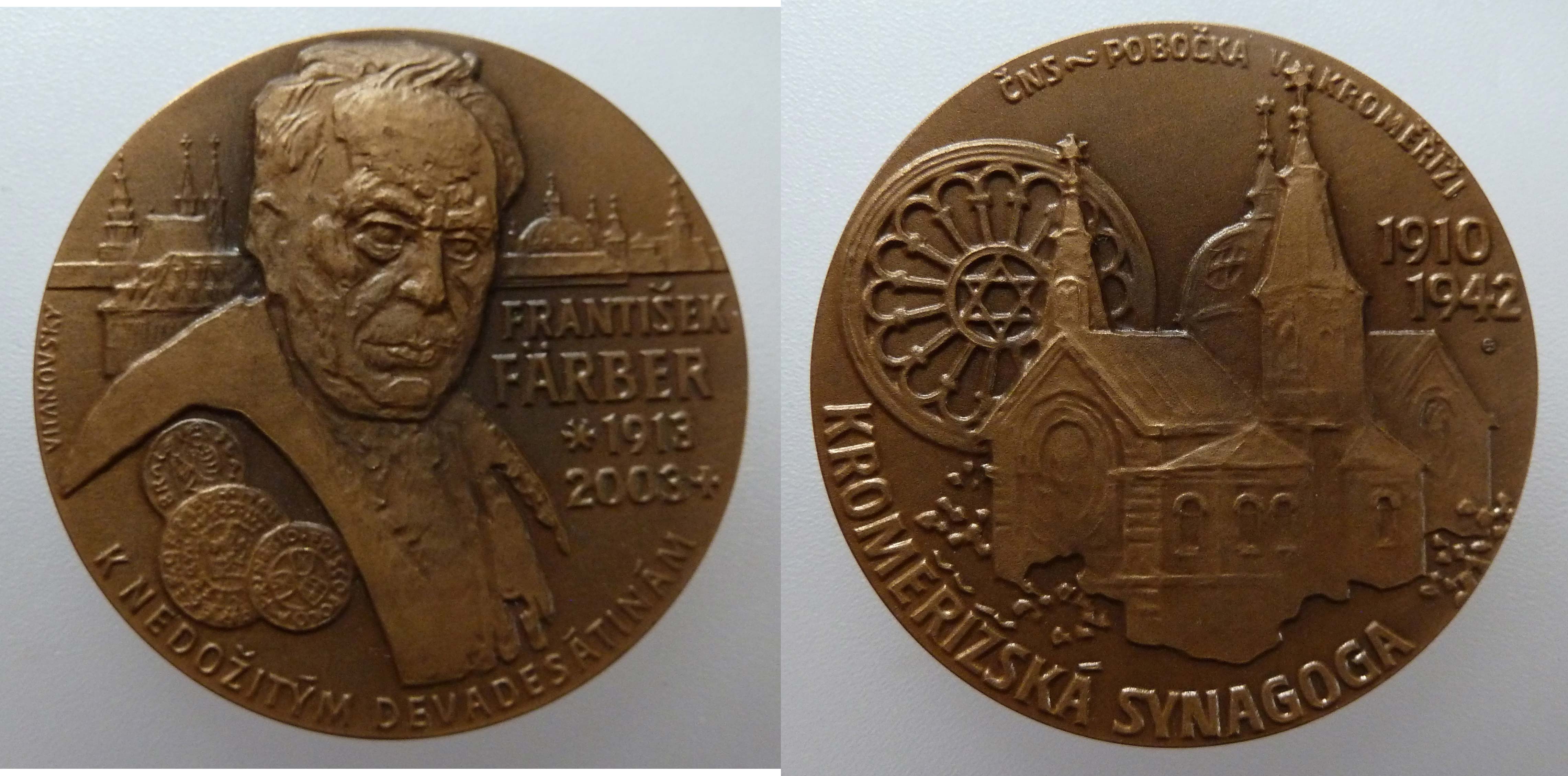 Vitanovský - Frant. Farber na 90.narozeniny 2003 - poprsí zprava, město, písmo / kroměřížská synagoga, písmo, Sign., patinovaný bronz 50mm, 70ks, etue R!