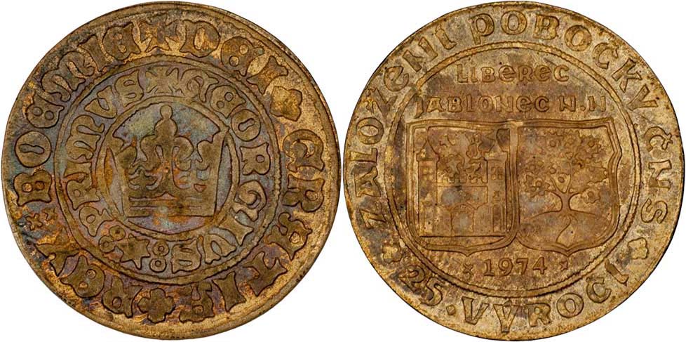 Přibyl - 25 let pobočky 1949/1974 - replika aversu pražského groše Jiřího z Poděbrad / znaky Liberce a Jablonce, písmo, bronz 27mm, BK.25/3A (5ks) RRR!