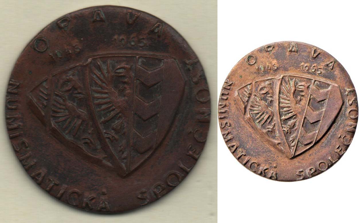 Šlosar - novoročenka - 20.výročí osvobození 1965 - dva překrývající se znaky města, opis, Nesign., patinov. jednostranný bronz 30 mm, BK.9 (40 ks) RR!