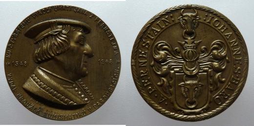 B.Jarý - Jan z Pernštejna - 400.výročí úmrtí 1948 - Poprsí zprava, vročení, opis / rodový znak a latinský opis, Sign., patinovaný bronz 40 mm, 41.491g, BK.3
