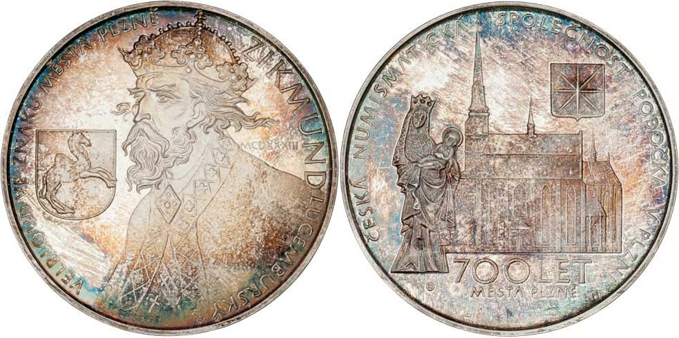 L.Kozák - 700 let Plzně - císař Zikmund 1993 - poprsí zleva, znak, opis/ chrám, madona, znak, písmo, Ag 900, 60mm, 99.546g, FM.18 (25ks), patina, etue RR!