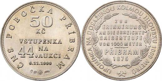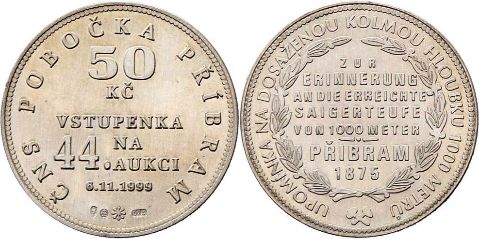Vstupenka na 44.aukci 6.11.1999 - replika reversu příbramského zlatníku / 6-řádkový nápis a opis, Nesign., Punc., Ag925, 27mm, 9.844g, pouze 30ks RR!