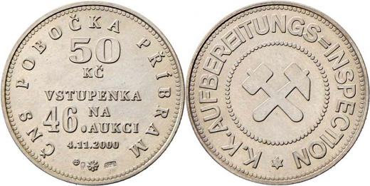 Vstupenka na 46.aukci 4.11.2000 - replika odznaku důlního inspektora / 6-řádkový nápis a opis, Nesign., Ag925, 27mm, 9.834g, pouze 30ks RR!