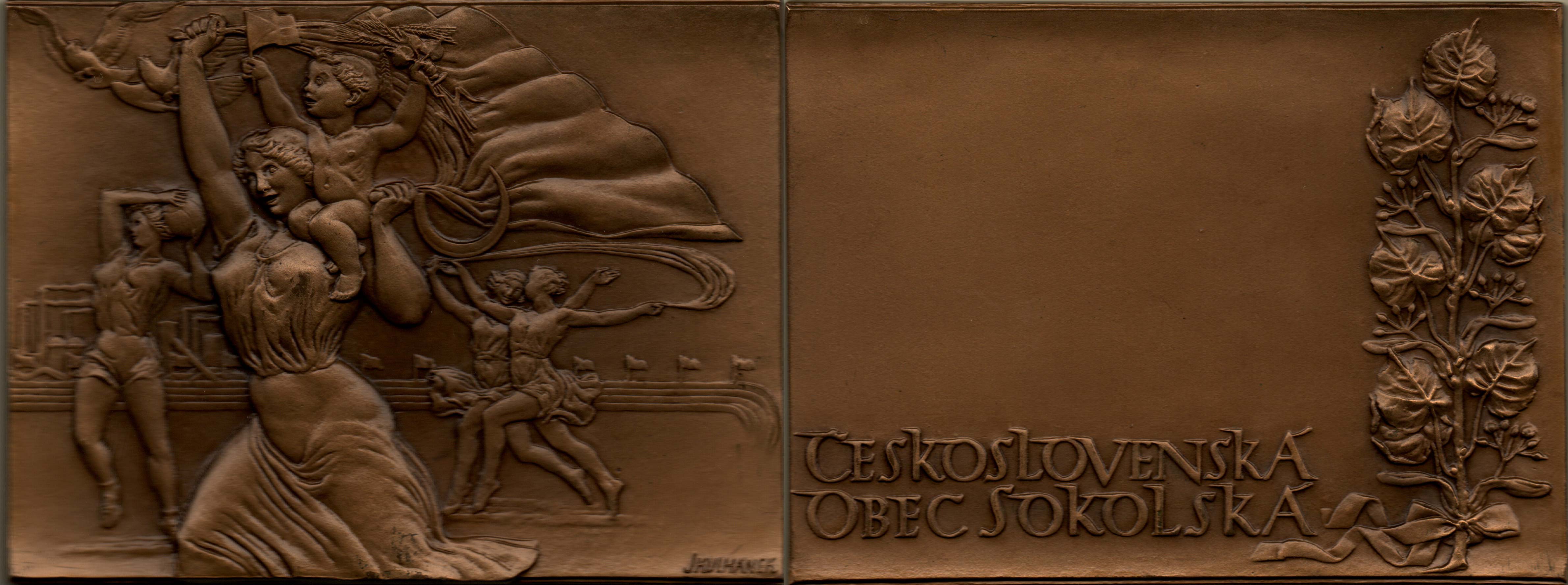 Československá obec sokolská b.l.- skupina sportovců, stadion a továrna/ lipová ratolest a 2-řádkový nápis, Sign., patinovaný bronz 100x75 mm