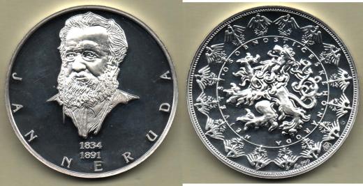 Největší osobnosti českého národa - Jan Neruda b.l. - poprsí čelně, vročení, opis / český lev, opis, kruh orlic, Sign., Ag999, 40mm, 29.013g