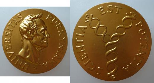 Brno - Universita Jana Evangelisty Purkyně b.l. - poprsí J.E.Purkyně zprava, latinský opis / stylizov. DNA, latinský opis, Sign., zlacený bronz 80 mm, téměř