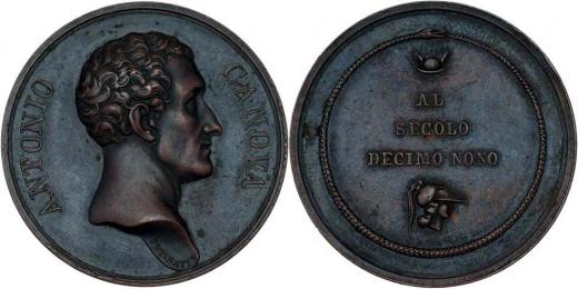Antonio Canova - medaile na příchod 19.století - poprsí zprava, opis / had stočený do kruhu, antické symboly, 3-řádk.nápis, Sign., měď 34 mm, škr., patina