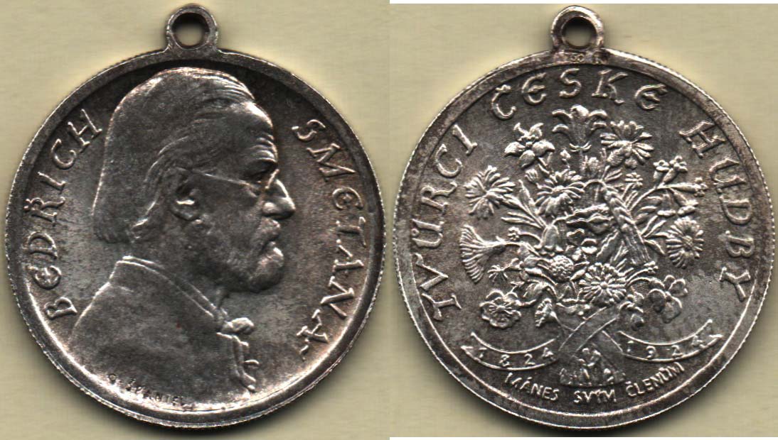 Bedřich Smetana - Mánes svým členům na rok 1924 - poprsí zprava, opis / kytice, stuha s nápisem a opis, Sign., Punc., Ag 750, 23mm s původním raženým ouškem