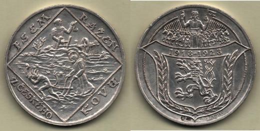 Jsem ražen z českého kovu - 10.výročí republiky 1928 - sv.Prokop orá s čertem, havíř, opis / státní znak, sv.Václav s rytíři, Sign., Ag987, 34mm, 19.979g