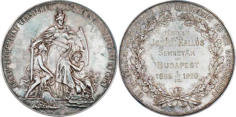 Záslužná medaile vídeňské akciové spol. "Donau" b.l. (ryté věnování z roku 1920) - alegorie, opis / věnov. ve věnci a opis, Sign., Ag 62mm, 94.020, patina R!