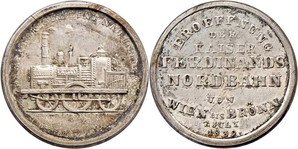 Heuberger - otevření železnice z Vídně do Brna 1839 - historická lokomotiva Pluto, opis / 9-řádkový nápis, Sign., Nepunc., dutá Ag medaile 27mm, 4.744g R!