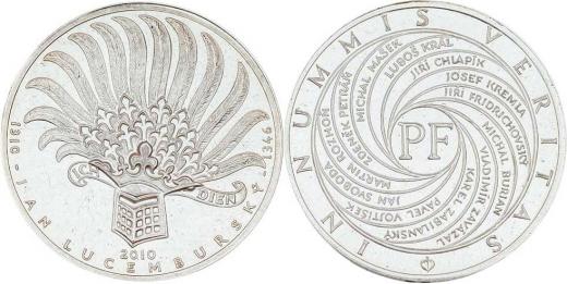 PF 2010 - Jan Lucemburský - přilba s králov. korunou, chocholem a stuhou, opis/ v paprscích jména vydavat., velké "PF" a opis, Sign., Ag925, 30mm, 15.010g R!