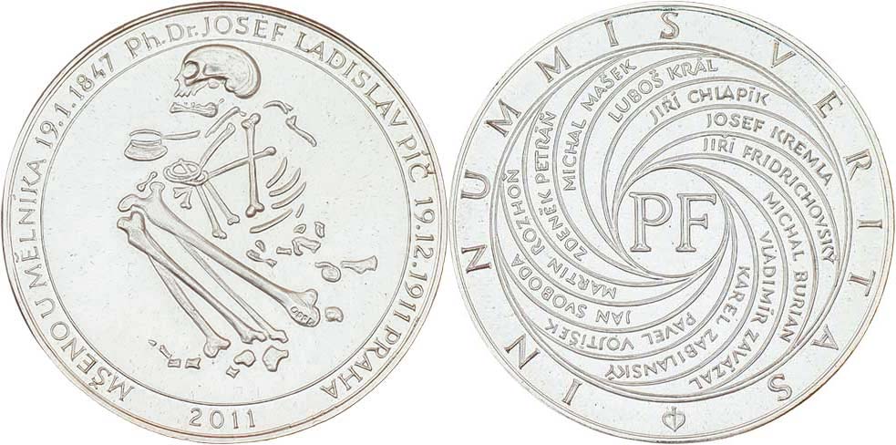 PF 2011 - Prof. Josef Ladislav Píč - hrob s kostrou ve skrčené poloze, opis / v paprscích jména vydavat., velké "PF" a opis, Sign., Ag925, 30mm, 13.888g R!