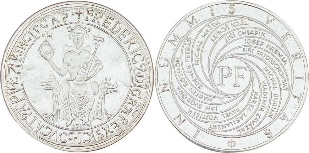 PF 2012 - Zlatá bula sicilská - líc pečeti císaře Friedricha II., opis / v paprscích jména vydavatelů, velké "PF" a opis, Sign., Ag925, 30mm, 13.944g R!