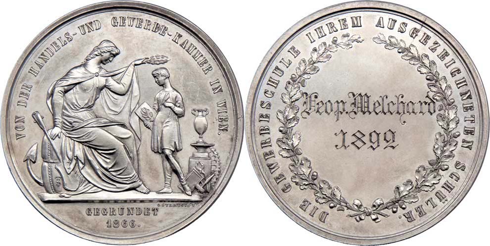 Schteinbock - Živnostenská škola b.l. - medaile pro premianty - alegorie, opis a nápis / ryté věnování, věnec, opis, Sign., Ag 49mm, 43.361g, nep.rysky