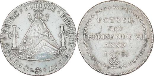 Ferdinand VII. - AR nást.medaile ve váze 8 Reálu 1808 - hora Matky Boží v Potosí, dva sloupy, opis / nápis a květina ve věnci, 38mm, 26.931g, m.o., patina RR!