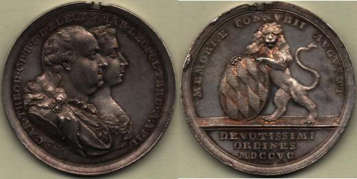 Karel Theodor a Marie Leopoldina - svateb. jeton 1795 - dvojportrét zprava, opis / lev s bav.znakem, písmo, Ag 33mm, 14.571g, vylom.ouško, rysky, dr.vady razidla