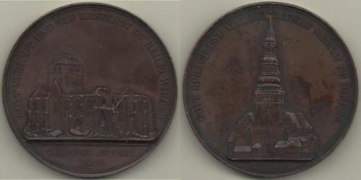 Na obnovu vyhořelého kostela sv.Mikuláše 1842 - chrám po roce 1657, opis / chrám po požáru 5.5., písmo, nápis na hraně, Nesign., měď 44 mm, Gaed.1370, dr.hr.