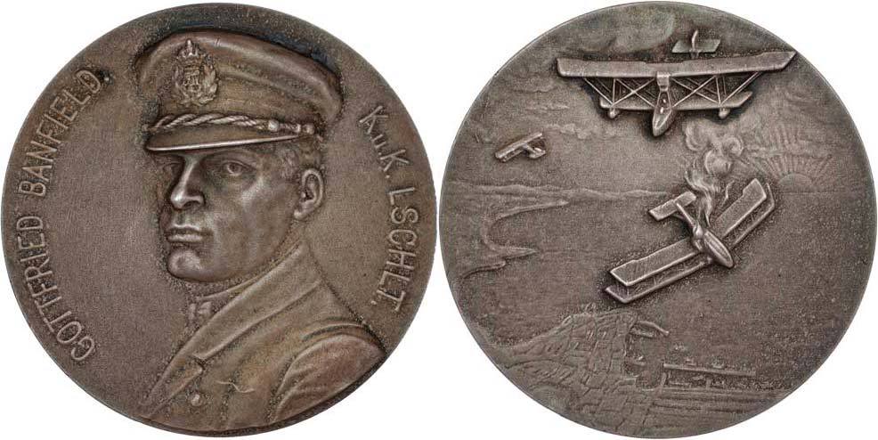 Gottfried Von Banfield, zvaný také "Orel Terstu" b.l. - poprsí zleva, opis / souboj hydroplánů nad mořem, Nesign., Punc.Ag, 50mm, 52.366g, původní etue R!