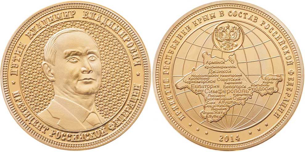 Připojení Krymu k Ruské federaci 2014 - portrét Vladimíra Vl. Putina, opis / mapa Krymu a znak RF na globu, Nesign., pozlacená mosaz 38 mm, kapsle
