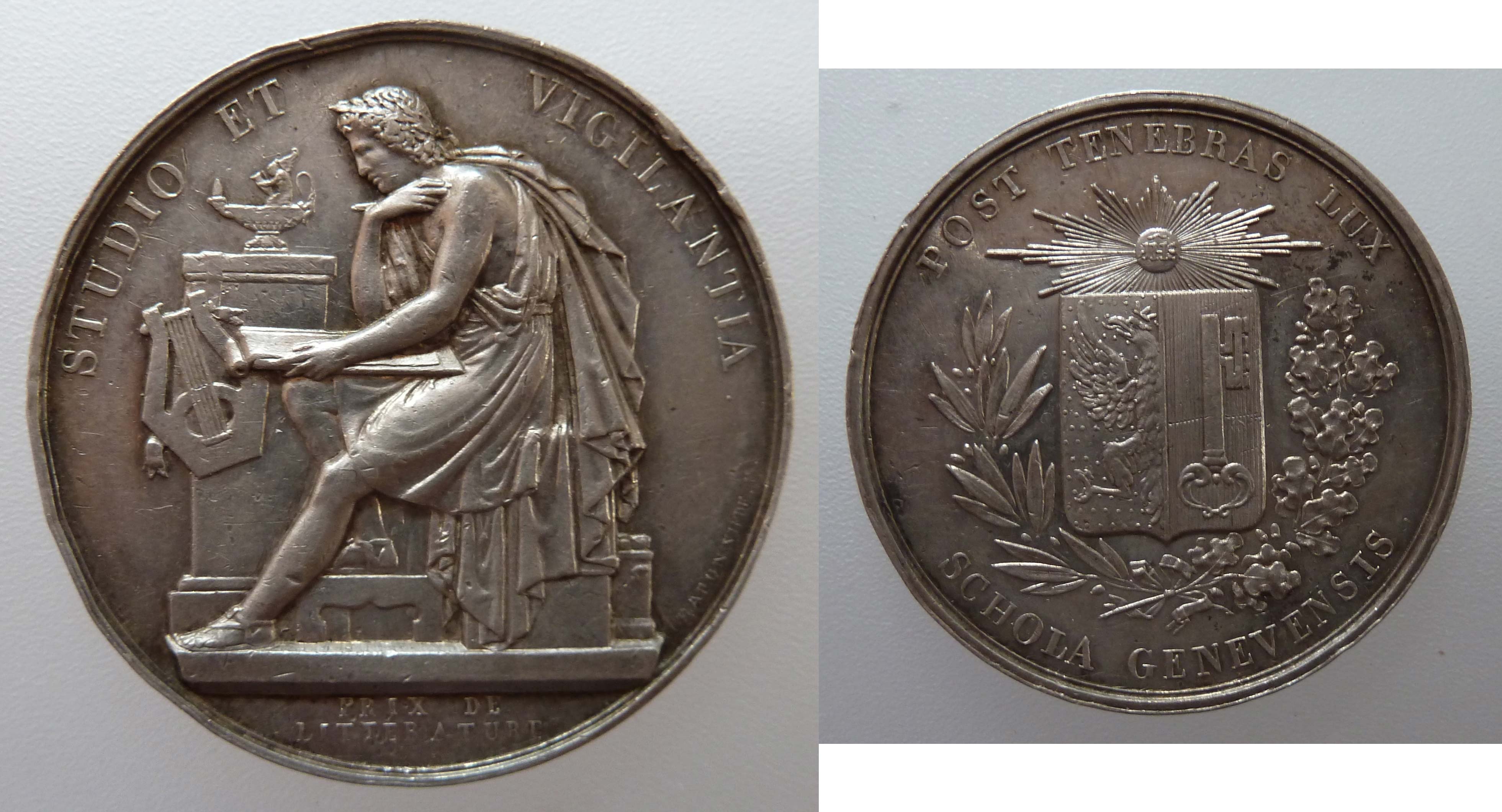 Ženeva - AR školní prémie b.l. - sedící Apolón, opis a nápis / zářící znak města, věnec, opis, špatně čit. signatura, 41mm, 27.520g, hr., dr.škr., rysky, patina