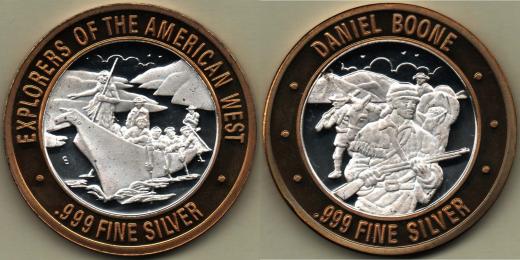 Lewis a Clark na lodi, opis/ Daniel Boone s puškou, opis, Nesign., Ag999, 43mm, 37.768g, opisy v pozlac. mezikruží, kapsle