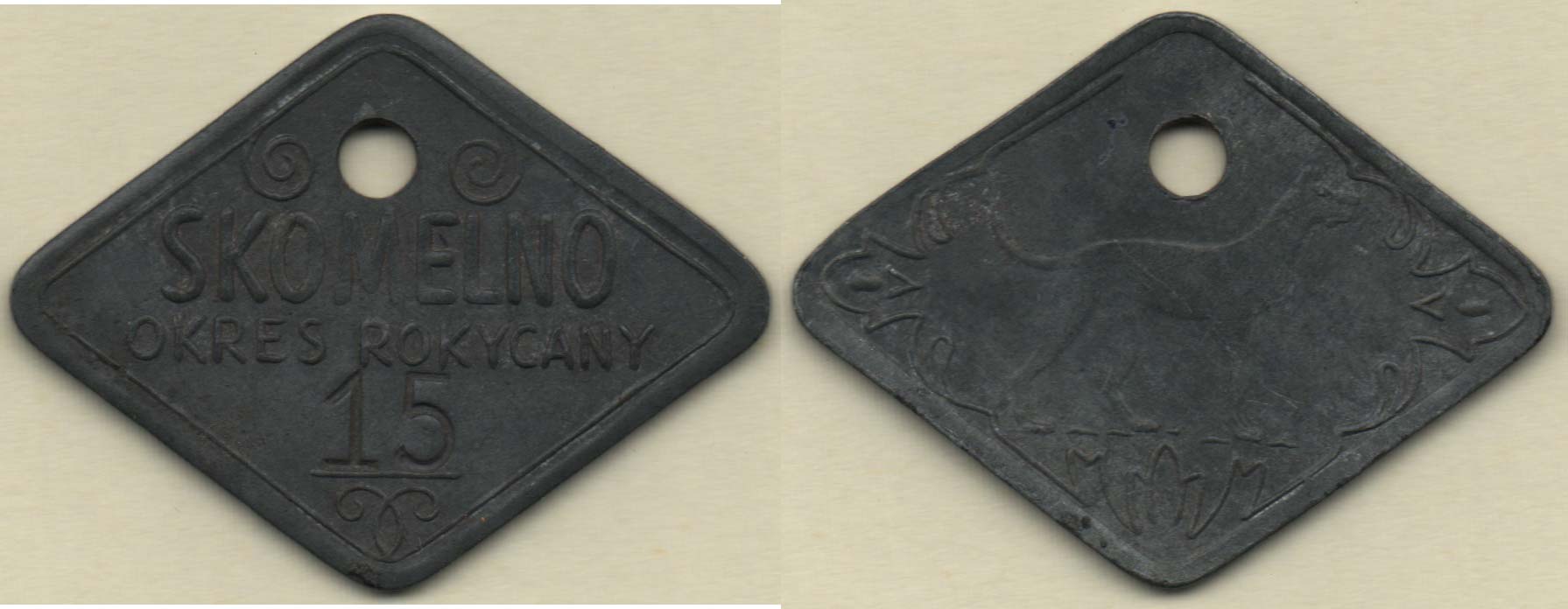 Skomelno (okr. Rokycany) b.l. - číslo 15 - zinkový kosočtverec 36x28 mm s původním otvorem pro zavěšení