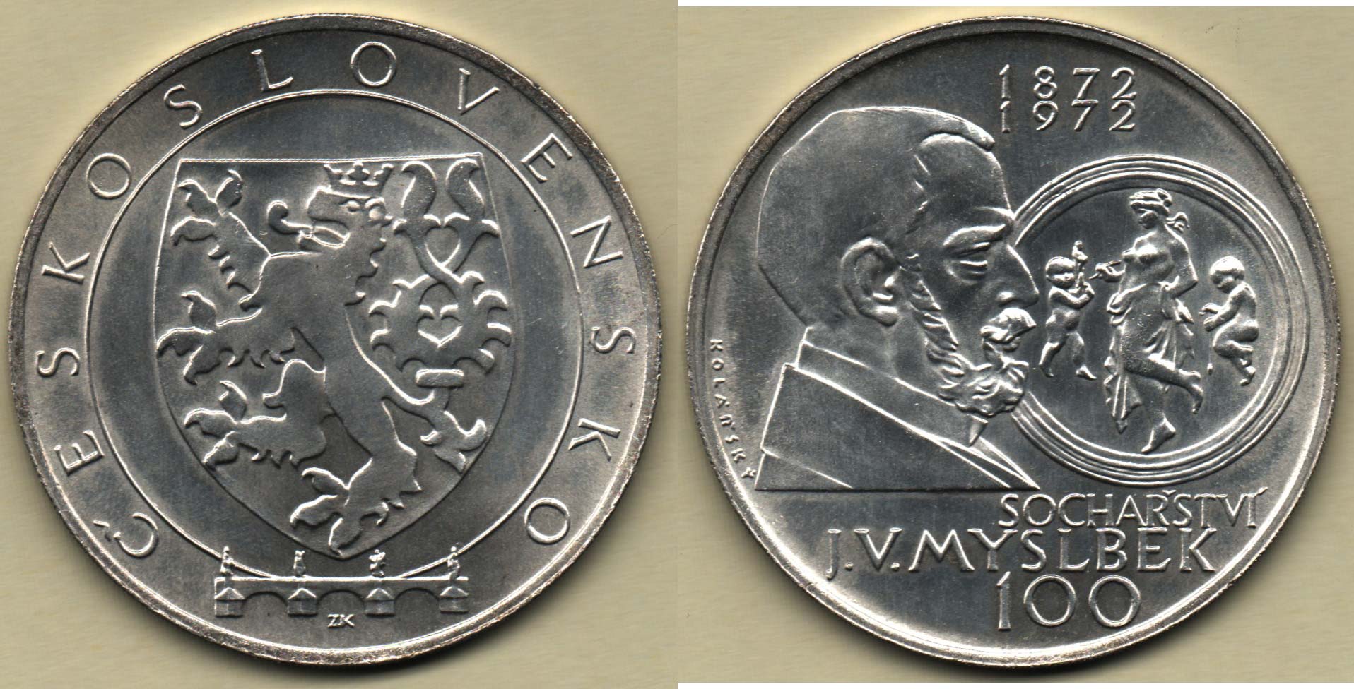 100 Koruna 1972 - Myslbek - zkušební ražba - Ag 39mm, 19.769g, Sign.Kolářský R!