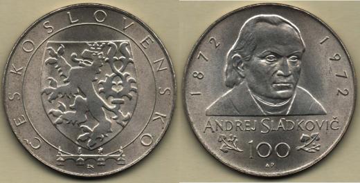 100 Koruna 1972 - Sládkovič - zkušeb.ražba - Ag 39mm, 24.823g, Sign.AP/ZK (Andrej Peter, Zdeněk Kolářský), nep.rysky, téměř