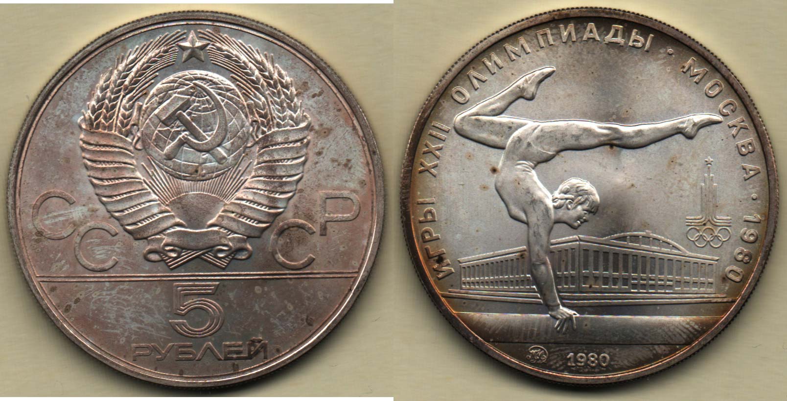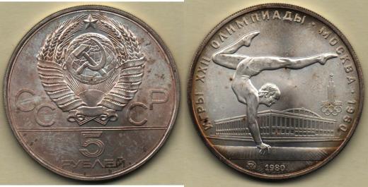 5 Rubl 1980 MMD - LOH gymnastika, Y.180, 16.421g, skvrnky, patina, téměř