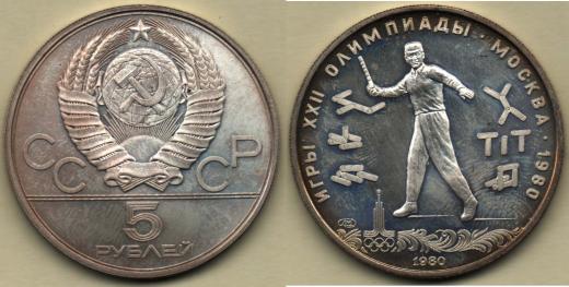 5 Rubl 1980 LMD - LOH gorodky, Y.182, 16.641g, skvrny, patina, téměř